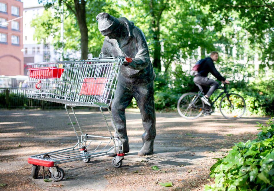 En medio de un parque de la ciudad, apareció una escultura anónima de un hombre empujando con cierto esfuerzo un carrito de compras vacío. El hombre, que invita a pensar en un trabajador industrial o pesquero, y el carro sin ningún alimento, suscitan un efecto emotivo y político al instante: una feroz denuncia contra el capitalismo, aún en una de las mayores economías mundiales.