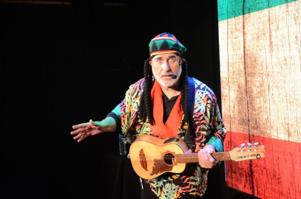 Hay chistes e historias donde el comediante narra la vida cotidiana y también invita a un viaje imaginario por distintas partes del mundo que colorea con sonidos, música y expresión corporal.