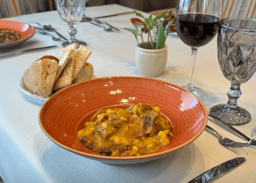 El plato fuerte permite elegir entre locro criollo o humita cremosa, acompañados de salsas típicas. El cierre es una degustación de postres patrios, con bebida sin alcohol y una copa de vino.