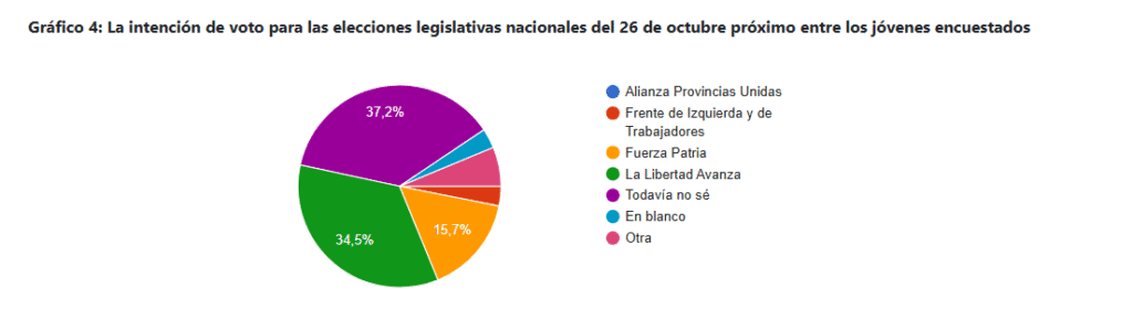 De cara a las elecciones nacionales del 26 de octubre, se observa un marcado incremento en la disposición a votar: el 75% de los jóvenes manifestó que concurrirá a las urnas, un aumento de veinte puntos porcentuales respecto a los comicios del 7 de septiembre. Este dato sugiere una mayor importancia asignada a la elección de autoridades nacionales.