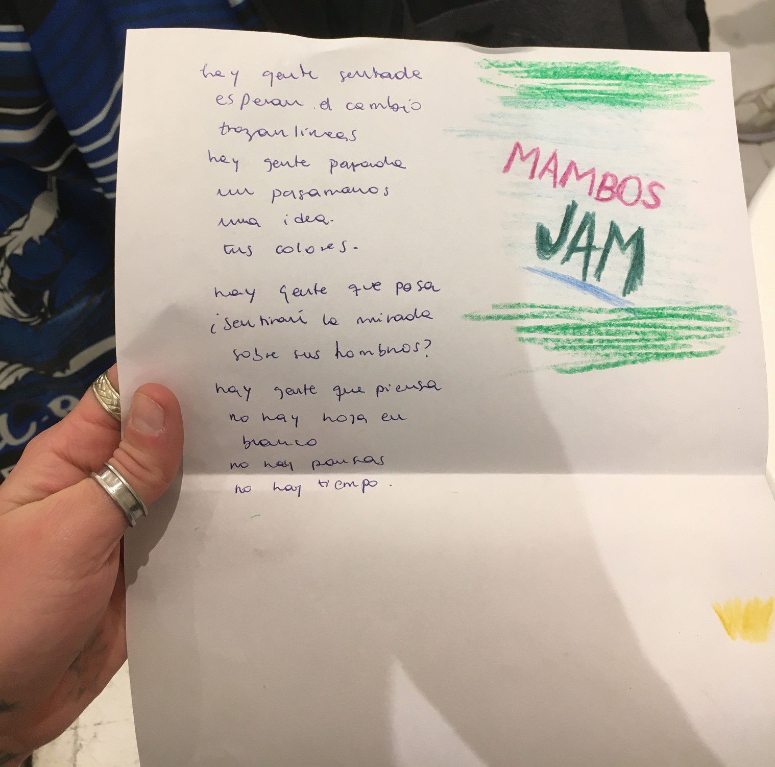 Mambos Jam es un evento que se realiza mensualmente bajo la premisa de juntarse a dibujar. Cada edición se realiza en un espacio distinto de la ciudad —casas de té, plazas, librerías, centros culturales, son algunos de los lugares en los que se han hecho hasta el momento—, siempre con entrada libre y gratuita. La próxima jam será el domingo 16 de noviembre de 19 a 20.30 hs. en el Club Tri (20 de septiembre 2650), dentro del festejo cultural “Ant1domingo”.