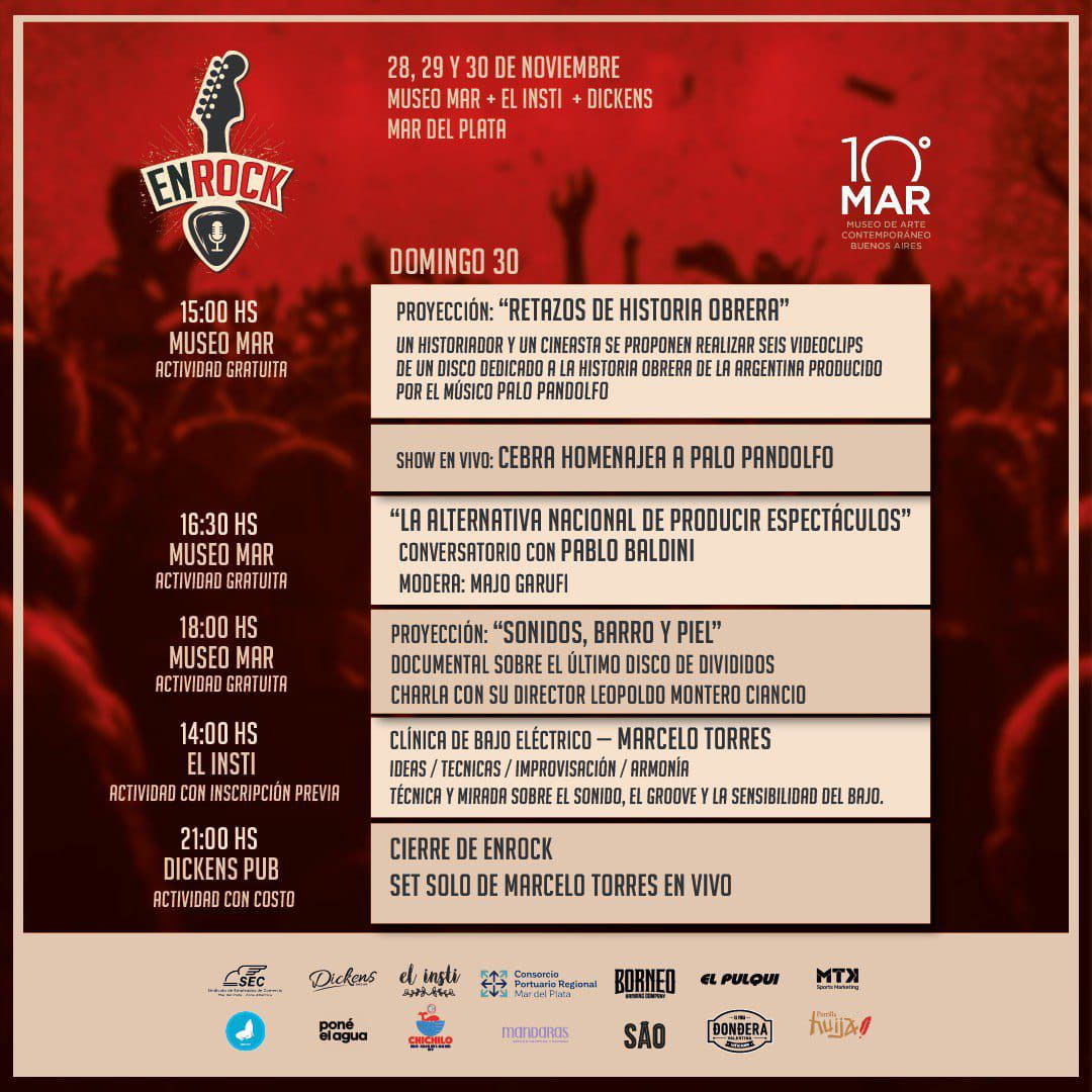 El cierre musical tendrá lugar en Dickens, con un concierto íntimo de Marcelo Torres, reconocido bajista con una trayectoria que abarca Spinetta y los Socios del Desierto, el Lito Vitale Cuarteto y Los Fundamentalistas del Aire Acondicionado. Torres también dictará una Clínica de Bajo Eléctrico, de costo popular y con inscripción previa, centrada en su visión del instrumento y su recorrido junto a referentes históricos del rock nacional.