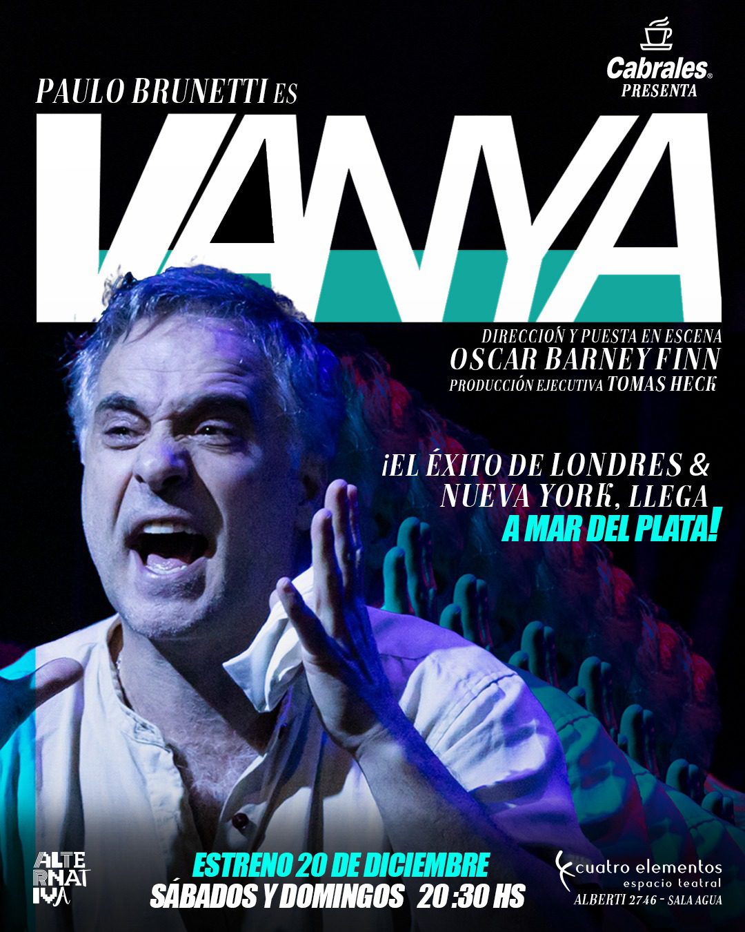 El sábado 20 y domingo 21 de diciembre a las 20:30 será el fin de semana de estreno de VANYA, la adaptación unipersonal del clásico de Chéjov dirigida por Oscar Barney Finn y protagonizada por Paulo Brunetti. La obra se presentará Espacio Cuatro Elementos (Alberti 2746), donde tendrá funciones todos los sábados y domingos de enero y febrero en la Sala Agua del complejo. Las entradas están en venta en la web del teatro, Alternativa Teatral y Fanz.