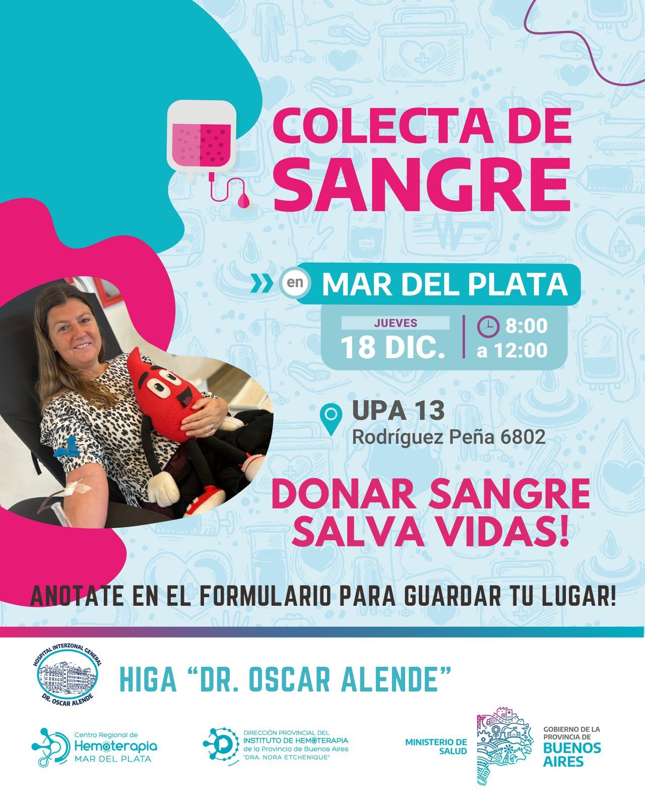 El jueves 18 de diciembre se llevará adelante una nueva colecta de sangre organizada por el Hospital General de Agudos Dr. O. Alende. La jornada será en la UPA 13 (Rodríguez Peña 6802) de 8 a 12. Los donantes que quieran reservar un turno, pueden hacerlo a través del siguiente formulario: Colecta de sangre diciembre higa 2025.
