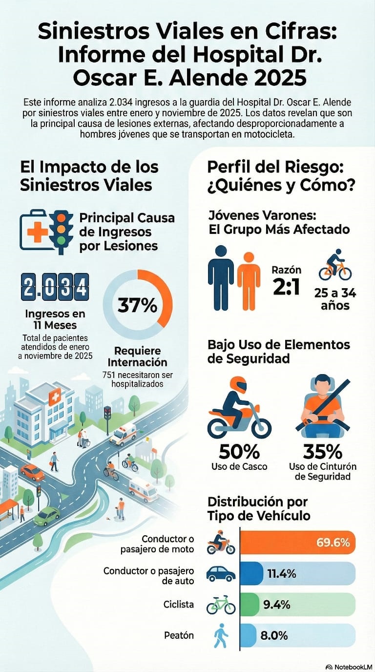 Los siniestros viales son el primer lugar entre las causas de ingresos e internaciones por lesiones en el Hospital Interzonal General de Agudos (HIGA) Dr. Oscar Alende, consolidándose como uno de los principales problemas de salud pública de la ciudad y la región.