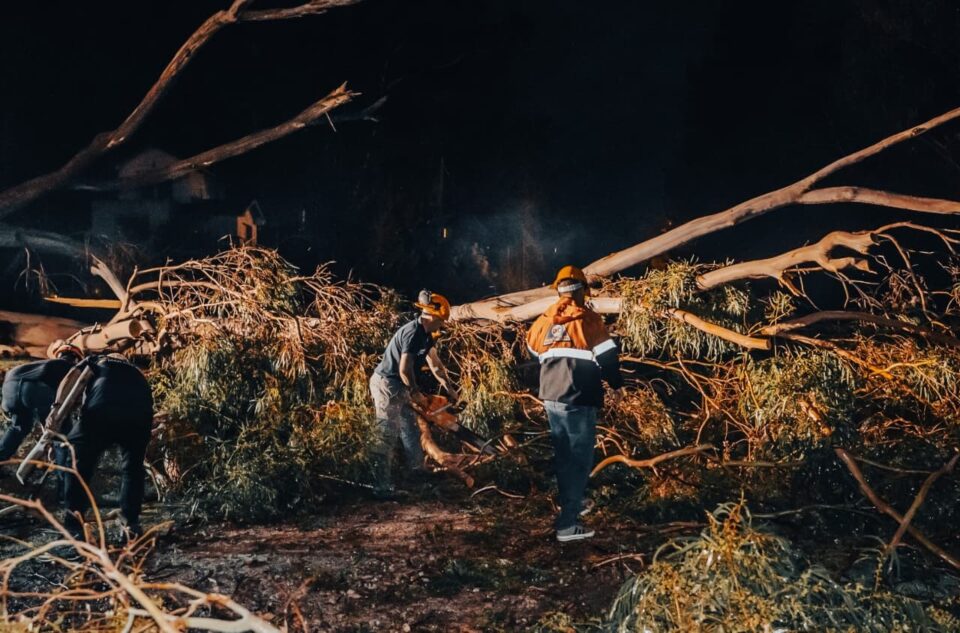 Durante la noche, Defensa Civil trabajó de manera articulada con el EMSUR, áreas operativas municipales, Bomberos Voluntarios y Bomberos de la Provincia, priorizando las situaciones de mayor riesgo. En la zona de Sierras estuvieron presentes autoridades municipales coordinando el despliegue de recursos.