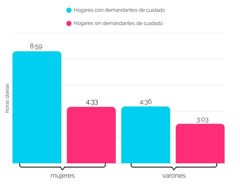 La cuestión de la distribución de las tareas de cuidado es un punto clave para entender las dificultades que atraviesan las mujeres en el mundo laboral. Según un informe elaborado por el CIPPEC (Centro de Implementación de Políticas Públicas para la Equidad y el Crecimiento), a partir de los datos proporcionados por la Encuesta Nacional de Uso del Tiempo 2021 (realizada por el INDEC), en los hogares con demandantes de cuidado, las mujeres destinan el doble del tiempo que los varones a las tareas domésticas.