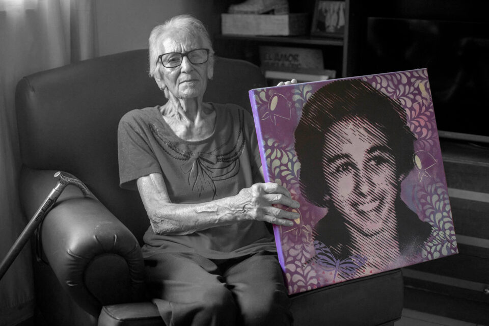 Frente al cuadro, sentada en un sillón amplio, está su madre, para verla en todo momento. Emilce Flores de Casado tiene casi 90 años y camina con un bastón. Cuando abre la puerta de su casa en el barrio Las Heras lo hace despacio, apoyándose primero en la reja y luego en el marco antes de dar el siguiente paso. Avanza con cuidado hasta el sillón y se sienta. Levanta la vista hacia el cuadro.